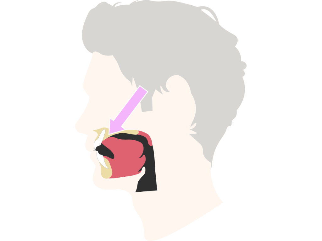Die Antwort ist ganz einfach: Das vordere Zungendrittel ruht knapp hinter den oberen Schneidezähnen am Gaumen. Die Zungenspitze drückt dabei nicht gegen die Schneidezähne. Das ist die Zungenruheposition.