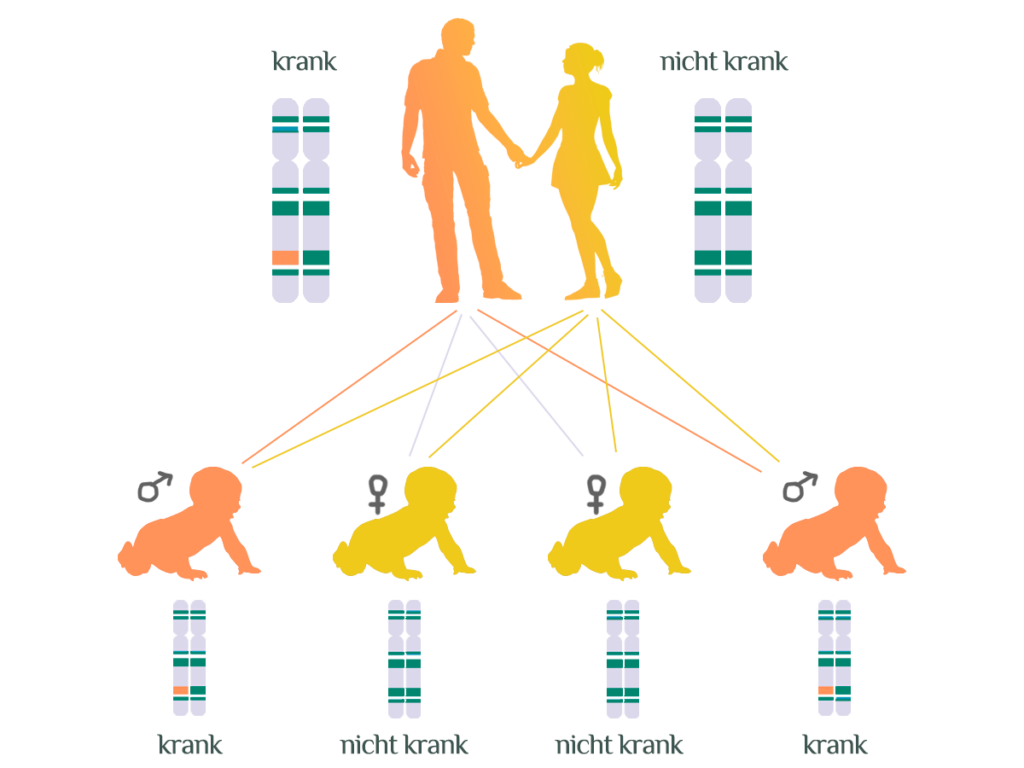 - Wenn ein Elternteil das mutierte Gen hat (und daher die Krankheit zeigt), besteht bei jedem Kind eine 50%ige Chance, dass es das mutierte Gen erbt und somit auch die Krankheit entwickelt.