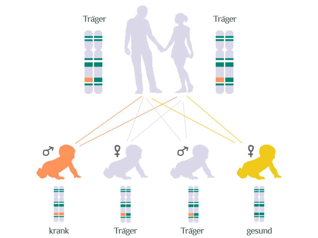 Bei einer autosomal rezessiven Vererbung müssen beide Kopien eines Gens mutiert sein, damit die Krankheit ausbricht. Das bedeutet: