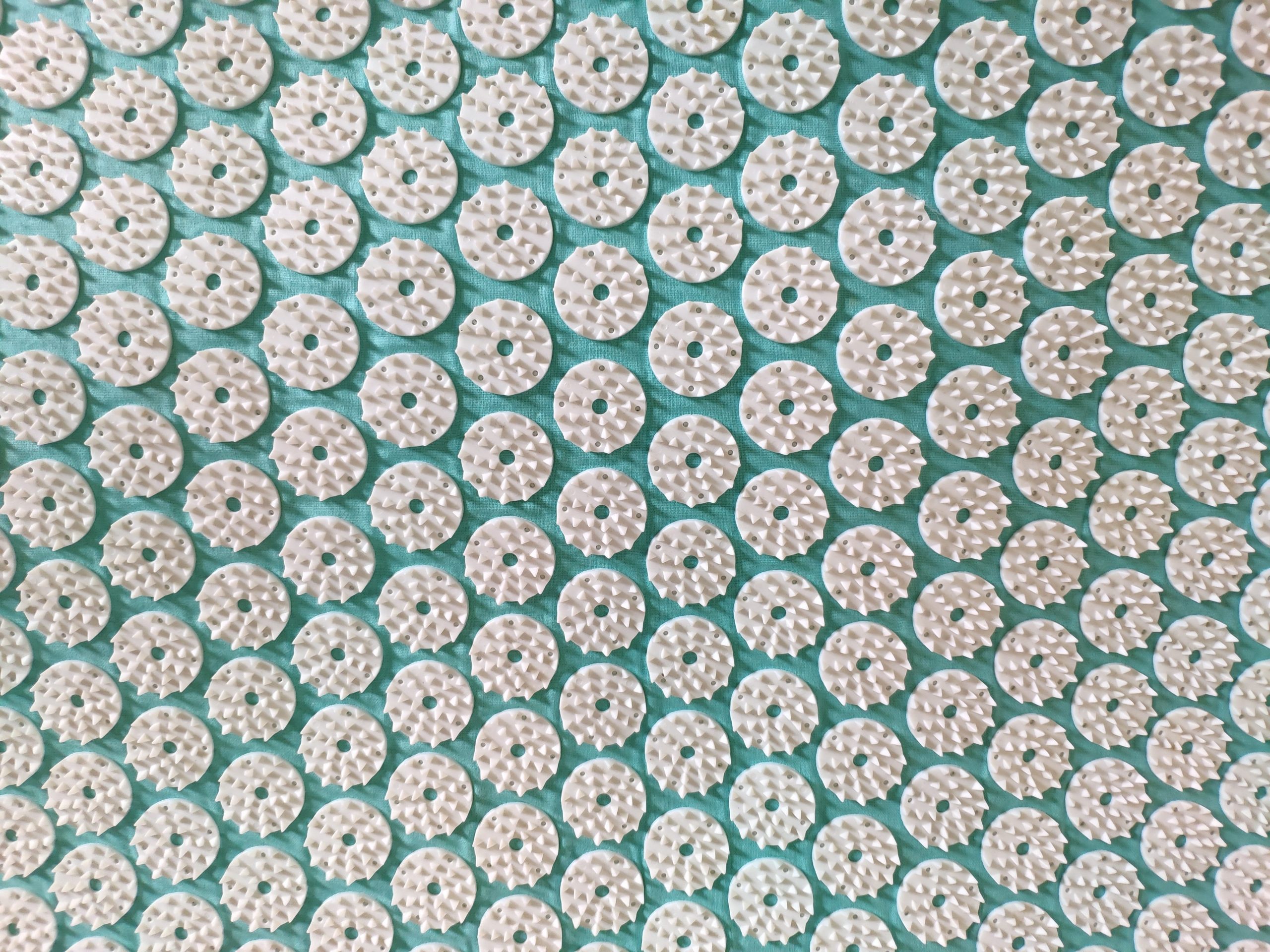 Oder wem es beliebt: Nadelkissen. Dabei handelt es sich um eine dünne Matte, die mit lauter eng beieinanderliegender Spitzen bestückt ist. Der Sinn dahinter wird deutlich, sobald man drauf liegt. Es piekt und stachelt durch jede Spitze, die sich in den Rücken bohrt wie ein winziger Fleischhammer. Der Effekt lässt nicht lange auf sich warten: Die Durchblutung des Gewebes wird angekurbelt – sichtbar an einer großflächigen Hautrötung – und somit ergibt sich eine Lockerung der Muskulatur. Angenehm fühlt sich das an, keine Frage, doch auf eine Instabilität der Kopfgelenke nimmt so eine Matte keinen Einfluss.