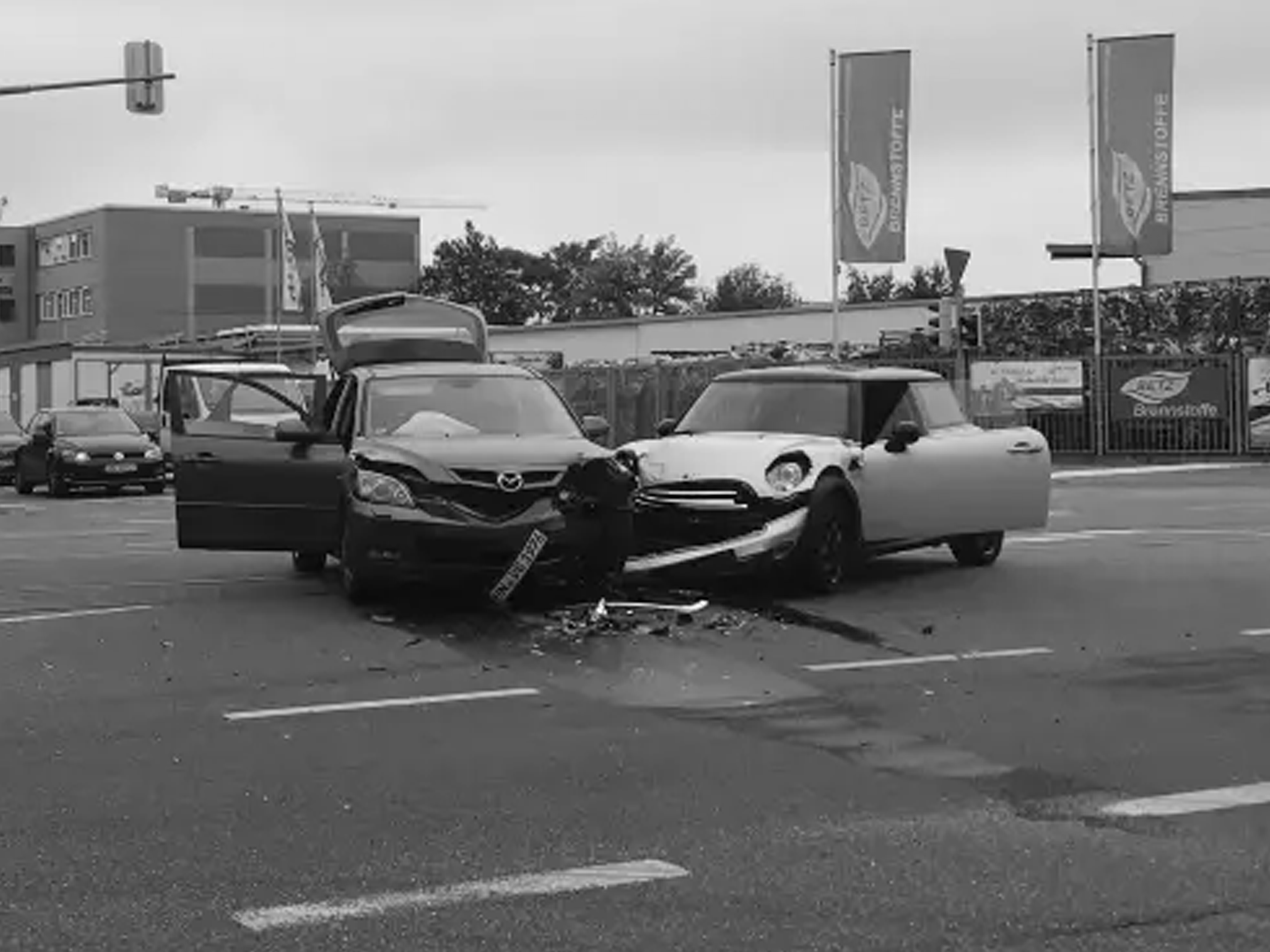 „Um ca. 14 Uhr machte es auf einer Kreuzung in der Austraße 155 in Heilbronn ganz entsetzlich RUMMMMS und KRACH! Ein linksabbiegender Mini (meiner) kollidierte mit einem aus dem nichts auftauchenden, geradeausfahrenden Mazda ungebremst. Ich bremste wenigstens noch … brachte aber auch nichts mehr. Noch heute kann ich die Bilder des Unfalls genau abrufen und höre noch den Knall… […] Ich weiß noch als ich im Auto saß was mir da durch den Kopf gegangen ist. Nach dem Aufprall war es erstmal totenstill.„