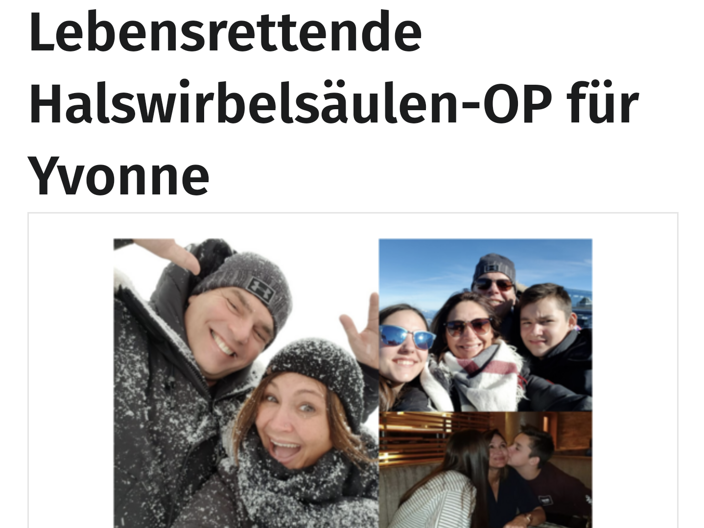Yvonne, eine 47 Jahre alte Ehefrau und Mutter, erlitt nach einem Atemwegsinfekt einen gesundheitlichen Absturz. Sie und ihre Lieben mussten zwei lange Jahre für die Suche nach Ursachen und Hilfe aufbringen. Das Ergebnis: Yvonne leidet an CCI, AAI, dem Eagle-Syndrom und weiteren strukturellen sowie funktionellen Störungen der Wirbelsäule. Die Hoffnung der ganzen Familie liegt nun auf einer operativen Therapie in Spanien. Und wir wissen: Das kostet massig Geld.