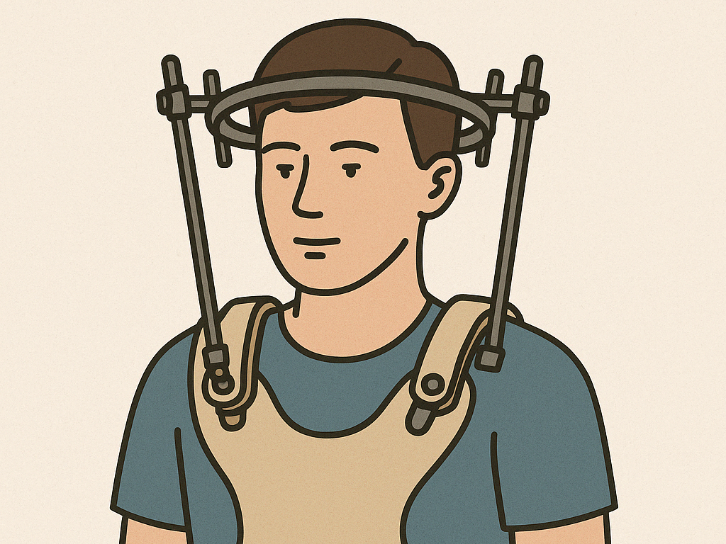 Ein überglücklicher Patient mit CCI in einer Halo-Weste: Der Halo-Ring wird am Schädel befestigt, Traktion wird angewendet und die Korrektur bildgebend überprüft. Danach wird der Ring mit einer Weste verbunden, um die Position zu fixieren. (Bild: wirbelwirrwarr)