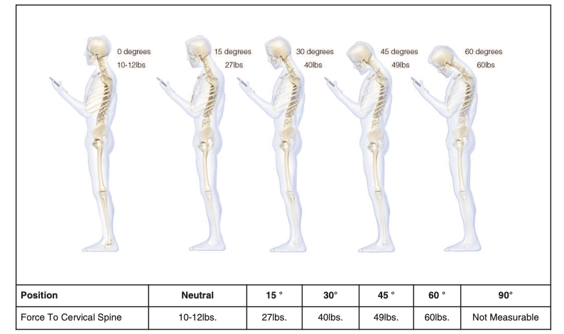 In einem Modellbericht von Hansraj (2014) lassen sich zum Beispiel anschauliche Zahlen zur Lastzunahme bei Vorneigung finden: Was bei 0° noch ca. 5 kg sind, wirkt bei 60° wie 27 kg auf die Halswirbelsäule. Diese Last muss tausendfach am Tag geführt werden.