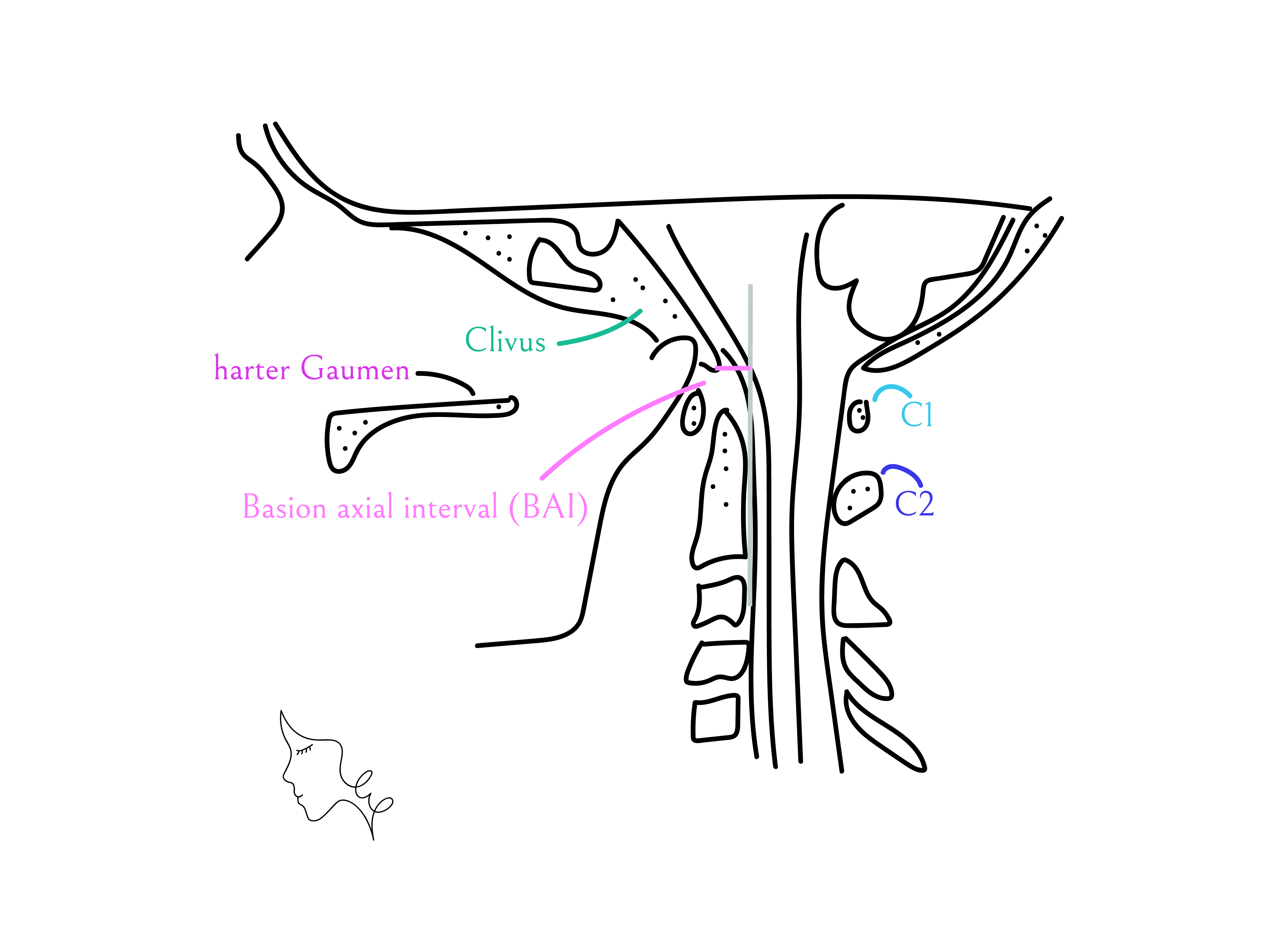 Abstand zwischen der unteren Spitze des Basion (vorderer Mittelpunkt des Formane magnum) und der Spitze des Dens axis. Ein Wert > 12 mm ist auffällig.