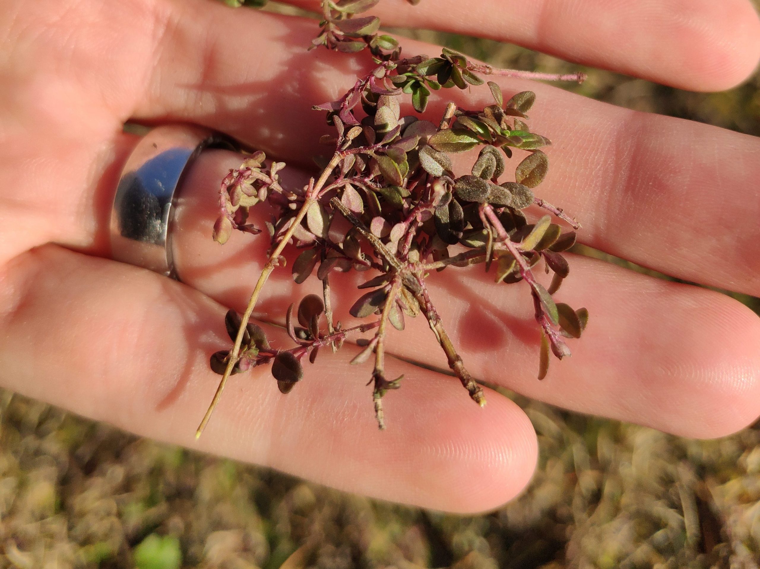 Kleine, zarte, spitz zulaufende Blättchen verstecken die nach unten hängenden violetten Blüten.